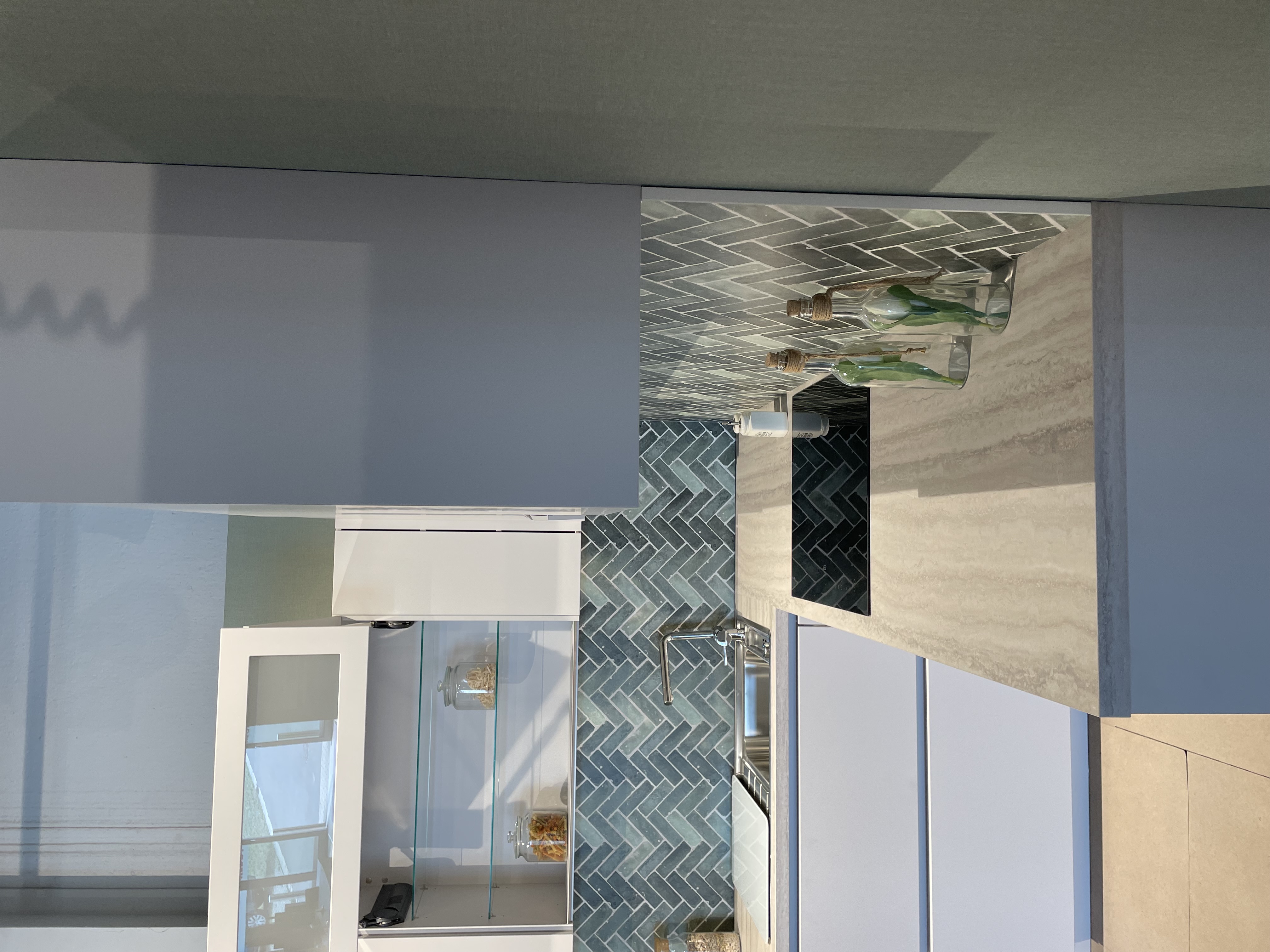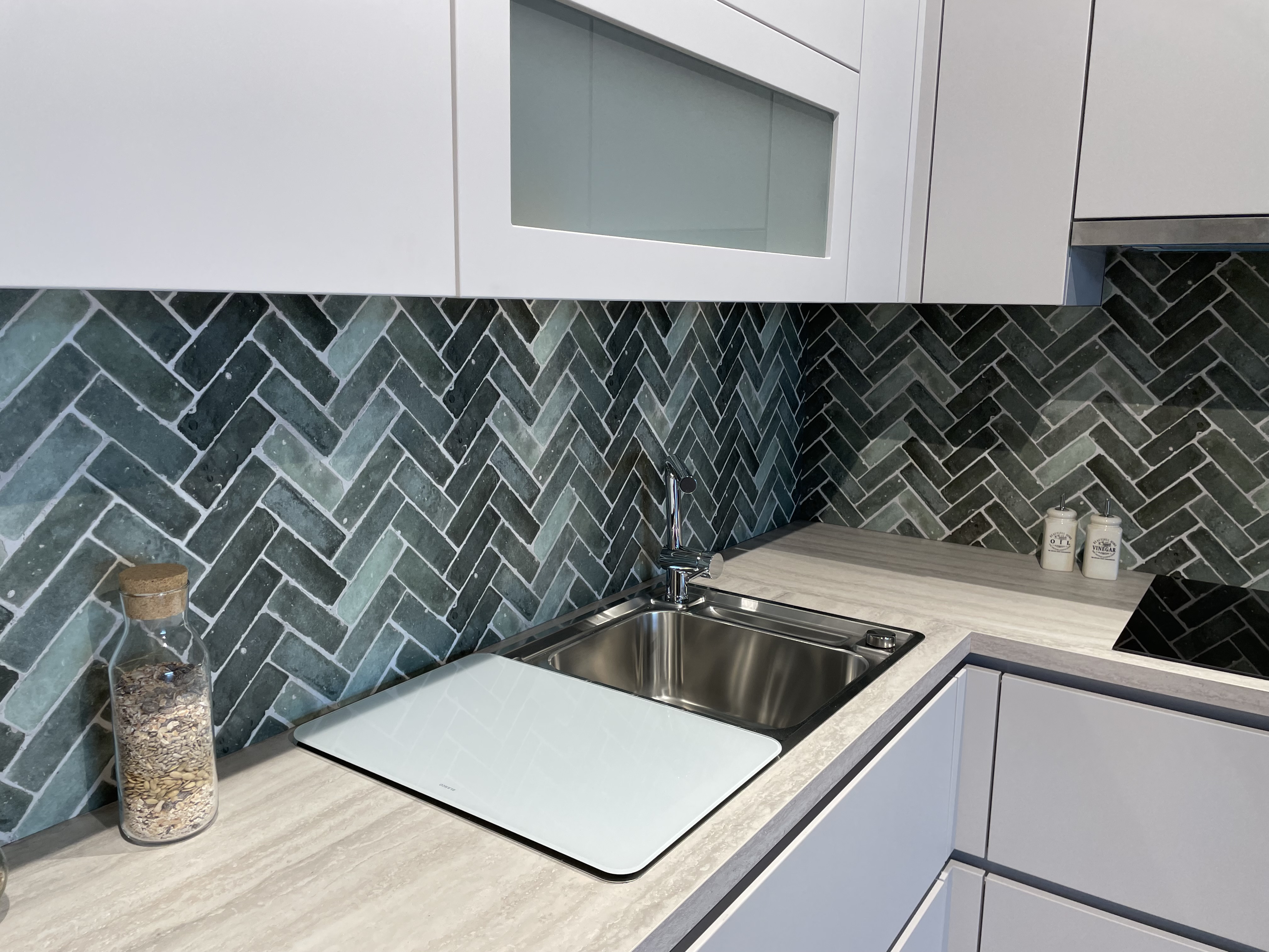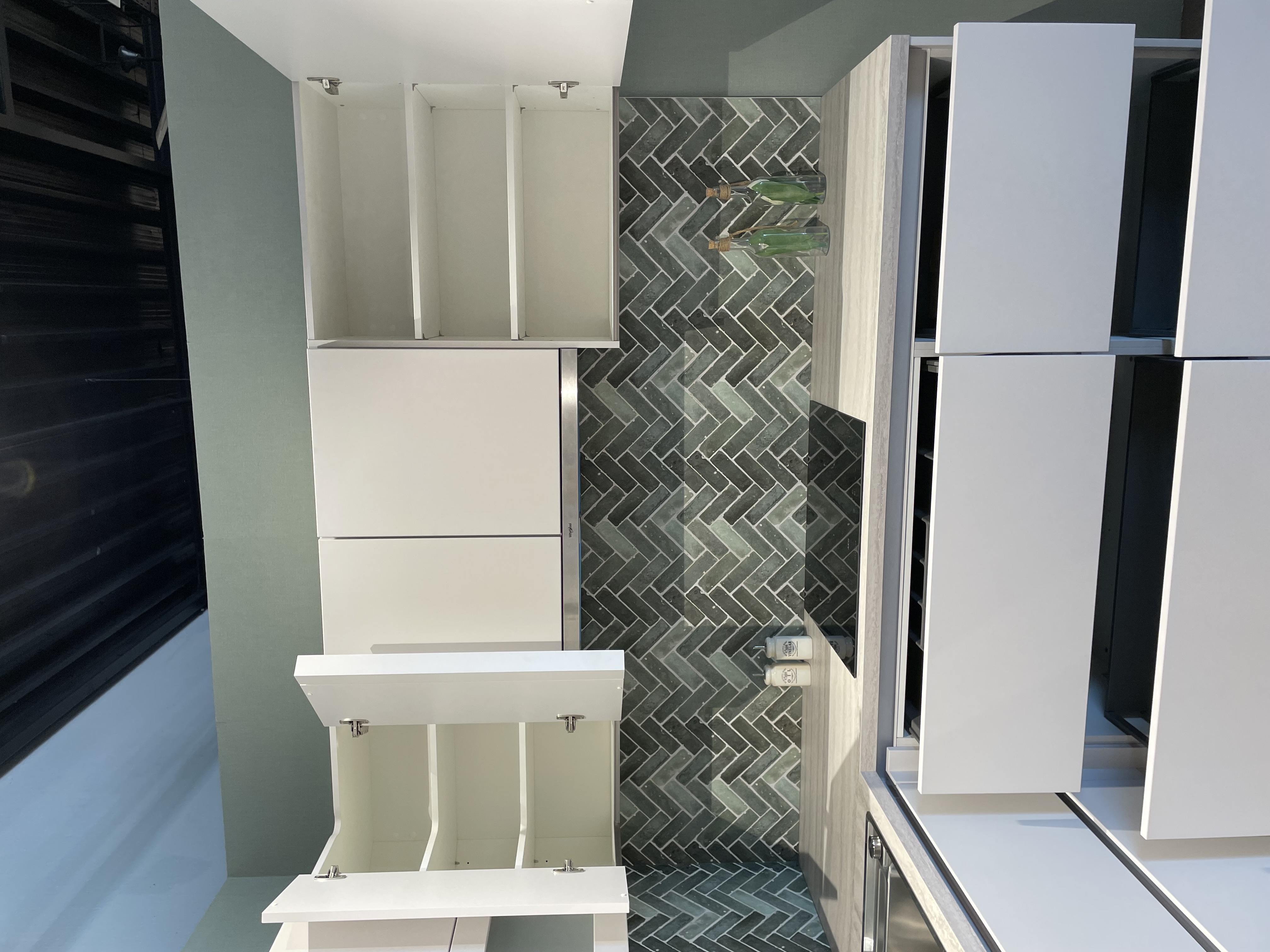 Front Lak Mat wit. Kolom voor koelkast 189cm, Kolomoven, nis voor ingebouwde vaatwasser , spoelkast met lades met afvalsortering, 2 dubbele lades, XL kasten, wand hoekkasten, hoog element met glazen vouwlift, inductiekookplaat, 90cm telescopische dampkap, actrewand in decor tegels diagonal groen.